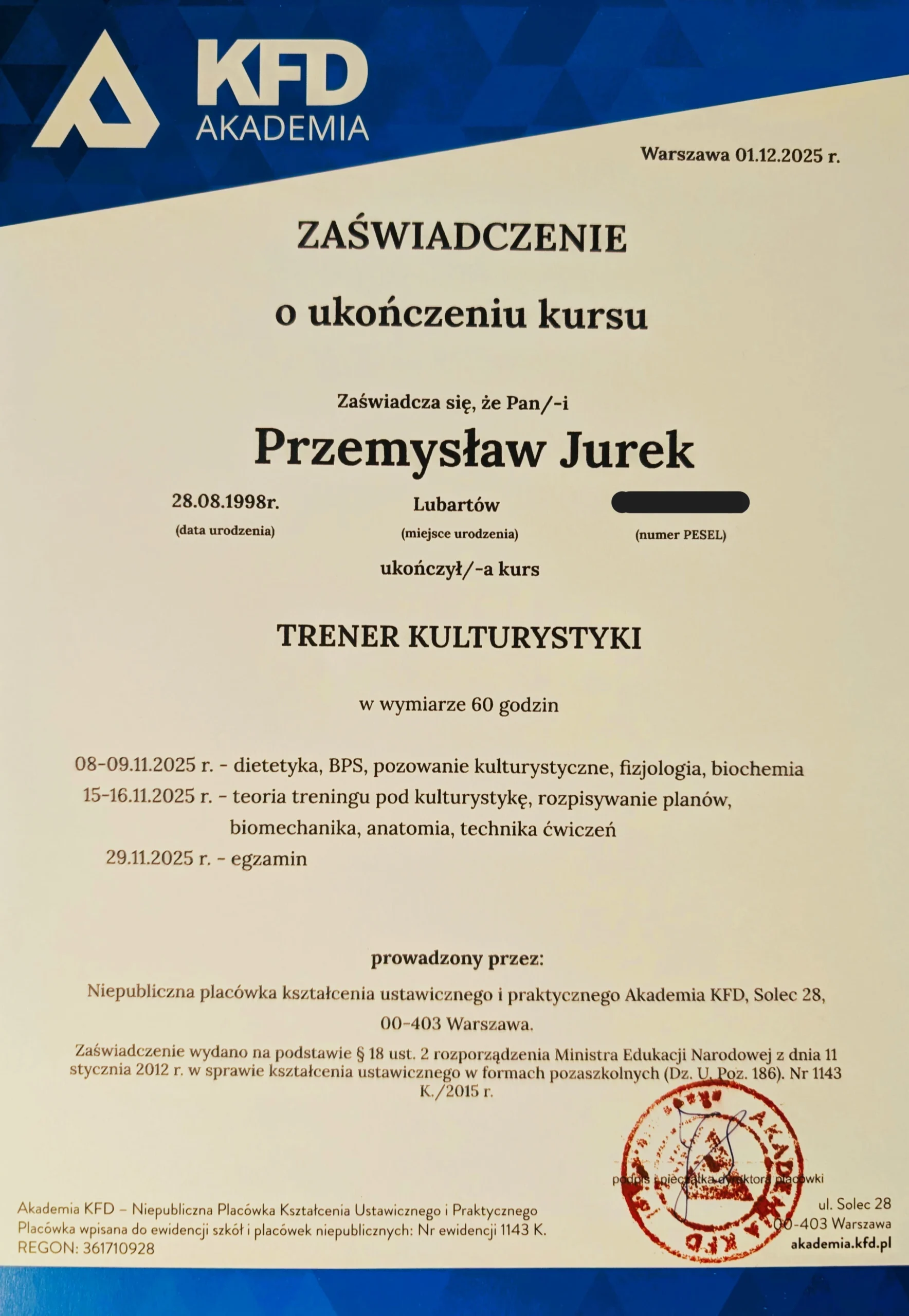 • Certyfikowany Trener Kulturystyki: Ukończony kurs trenera kulturystyki w Akademii KFD.